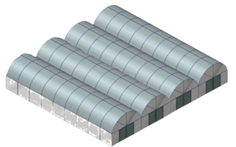 размер блока по фасаду 9,0м; шаг стоек 2,0м / 2,5м; высота в коньке – 5,0м; высота уровня горизонтальной шпалеры – 4,5м (для многопролетных сооружений) и 3,65м (для однопролетного тоннеля).